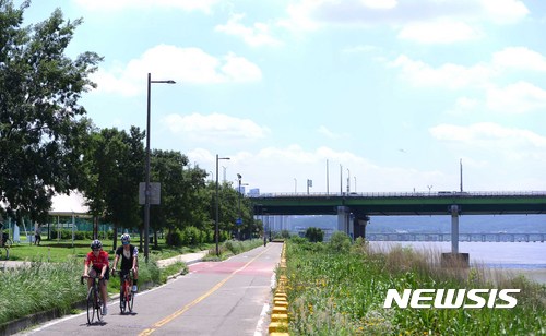 【서울=뉴시스】김선웅 기자 = 서울 최고기온이 34도를 기록하는 등 전국적으로 폭염이 이어지고 맑은 날씨를 보인 25일 오후 서울 강남구 반포한강공원에서 시민들이 자전거를 타고 있다. 2017.07.25.