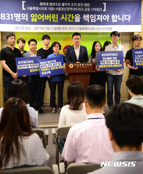 【서울=뉴시스】추상철 기자 = 서울시의회 의원과 청년정책 네트워크 회원이 27일 오전 서울 중구 서울시의회에서 '청와대 청년수당 외압 불이익 조치 문건'과 관련 공동 기자회견을 열고 청년수당 직권취소 사과 및 외압과정 진상규명, 재발방지대책 마련을 촉구하고 있다. 2017.07.27.