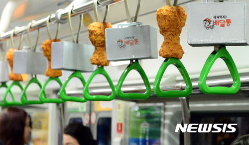 지난 19일부터 음식 주문 앱 '배달통'이 선보인 해당 광고는 서울 지하철 2호선 일부 차량에만 적용된 것으로 오는 8월 18일까지 만나볼 수 있다. 2017.07.31.