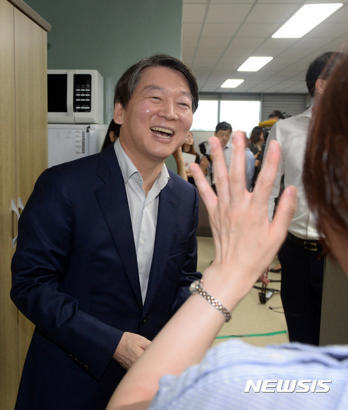 【서울=뉴시스】홍효식 기자 = 국민의당 안철수 전 대표가 10일 오전 서울 여의도 당사에서 8.27 전당대회 당대표 후보등록을 마친 뒤 당직자와 인사를 나누고 있다. 2017.08.10.