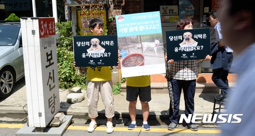 【서울=뉴시스】고범준 기자 = 동물자유연대와 동물보호시민단체 카라 회원들이 복날인 11일 오전 서울 서초동 법조타운 일대 식당가에서 개고기 반대 손 피켓을 들고 서 있다. 2017.08.11.