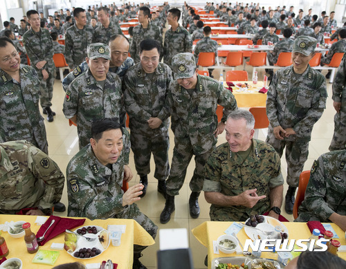 【하이청=AP/뉴시스】조지프 던포드 미군 합참의장이 16일 중국 하이청에 있는 북부전구 사령부를 방문해 송 푸쉬안 장군과 점심식사를 하며 담소를 나누고 있다. 북부전구는 한반도 유사시 가장 먼저 투입되는 중국군이다. 2017.08.16