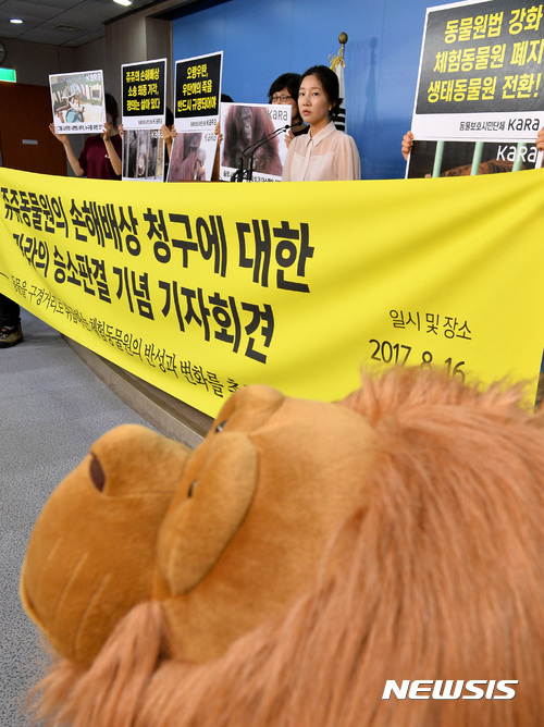 【서울=뉴시스】이영환 기자 = 동물보호 시민단체 KARA(카라) 측 서국화 변호사가 16일 오전 서울 여의도 국회 정론관에서 열린 '쥬쥬동물원의 손해배상 청구에 대한 카라의 승소판결 기념 기자회견'에 참석해 발언하고 있다. 2017.08.16.