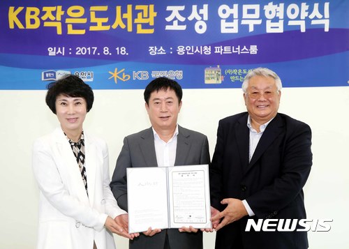 【용인=뉴시스】 이정하 기자 = 경기 용인시는 18일 시장실에서 정찬민 시장과 전영미 KB국민은행 강원․경기남지역영업그룹 대표, 김수연 (사)작은도서관만드는사람들 대표 등이 참석한 가운데 처인구 남사면 내기마을 '작은 도서관' 조성을 위한 업무협약을 했다고 19일 밝혔다. KB국민은행과 (사)작은도서관만드는사람들이 실시한 '작은도서관 조성사업' 공모에 선정됨에 따라 내기마을 복지회관 2층 공부방을 작은 도서관으로 꾸미게 된 것이다. 2017.08.19 (사진=용인시 제공)