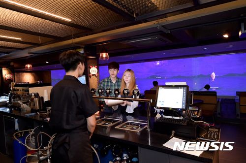 서울 송파구 신천동에 개장한 '피싱조이 신천점'에서 이용객들이 스크린낚시와 함께 다양한 맥주와 음식을 즐기고 있다.
