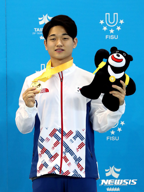【서울=뉴시스】최동준 기자 = 21일(한국시각) 대만 타이페이에서 열린 제29회 타이페이 하계U대회 수영(다이빙) 1m 스프링보드에서 금메달을 획득한 김영남이 기념촬영을 하고 있다. 2017.08.21. (사진=대한체육회 제공)