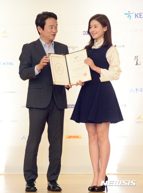 【서울=뉴시스】권현구 기자 = DMZ국제다큐영화제 조직위원장을 맡은 남경필 경기도지사와 홍보대사로 위촉된 배우 지우가 23일 오전 서울 중구 KEB하나은행 본점에서 열린 '제9회 DMZ국제다큐영화제' 홍보대사 위촉식에서 포토타임을 갖고 있다. 2017.08.23.