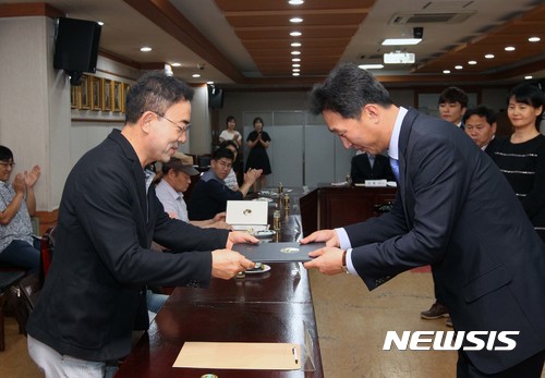 【서울=뉴시스】 28일 오후 이창우 동작구청장이 서울시 노량진동 동작구청에서 지방세 유공납세자에게 표창장을 전달 하고 있다. 2017.08.28. (사진=동작구 제공)