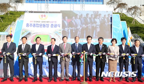 【충주=뉴시스】강신욱 기자 = 1일 오후 충북 충주종합운동장에서 열린 준공식에서 참석자들이 축하 테이프를 자르고 있다. 충주종합운동장에서는 9월15일 37회 전국장애인체전 개회식과 10월20일과 26일 98회 전국체전 개·폐회식이 열린다. 2017.09.01. (사진=충주시 제공)