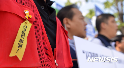 【서울=뉴시스】추상철 기자 =한국노총 전국공공산업노동조합연맹과 한국석유공사 노동조합이 12일 오후 서울 종로구 정부서울청사 앞에서 측근 채용 비리와 부당 노동행위 등을 이유로 김정래 한국석유공사 사장 해임을 촉구하고 있다. 2017.09.12.
