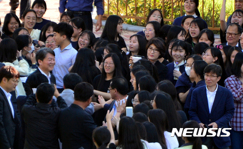 【청주=뉴시스】인진연 기자 = 국민의당 안철수 대표가 '교육의 미래, 한국의 미래'를 주제로 특강하기 위해 21일 충북 청주 일신여자중학교를 방문하자 학생들이 그의 얼굴을 보기 위해 몰려있다. 2017.09.21