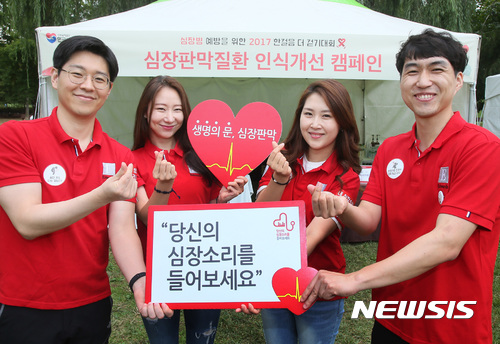【서울=뉴시스】23일 서울 송파구 올림픽공원에서 열린 ‘2017 심장병 예방을 위한 한걸음 더 걷기대회(주최 한국심장재단)’에서 에드워즈라이프사이언시스코리아 임직원이 심장판막질환 인식 향상을 위한 ‘당신의 심장소리를 들어보세요’ 캠페인을 펼치고 있다. 2017.09.23. (사진=에드워즈라이프사이언시스코리아 제공)