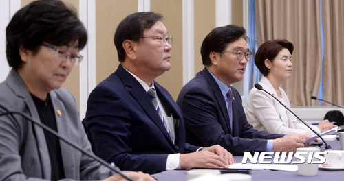 왼쪽부터 김은경 환경부 장관, 김태년 정책위의장, 우원식 원내대표, 한정애 제5정책조정위원회 위원장. 2017.09.25.