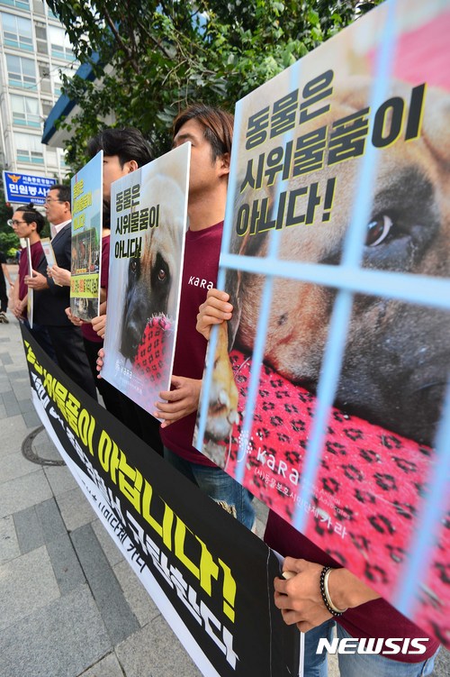 이는 지난 22일 대한육견협회가 세종로공원에서 개고기 합법화 집회를 열 당시 식용으로 사육된 개들을 데려온 것에 따른 기자회견으로, 카라는 종로경찰서가 이를 방관했다고 지적했다. 2017.09.27.