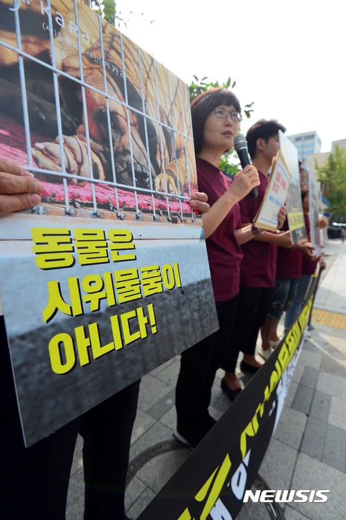 이는 지난 22일 대한육견협회가 세종로공원에서 개고기 합법화 집회를 열 당시 식용으로 사육된 개들을 데려온 것에 따른 기자회견으로, 카라는 종로경찰서가 이를 방관했다고 지적했다. 2017.09.27.