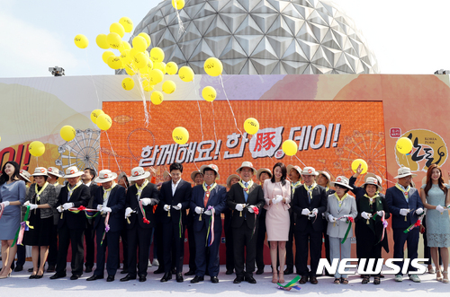 【과천=뉴시스】이종철 기자 = 30일 경기 과천 서울랜드에서 열린 '제4회 한돈데이' 행사에 참석한 농림축산식품부 김영록 장관, 농협축산경제 김태환 대표이사,  한돈자조금관리위원회 이병규 위원장, 한돈 홍보모델 배우 조정석, 헬로비너스 나라 등 참석자들이 테이프 커팅을 하고 있다. 2017.09.30.