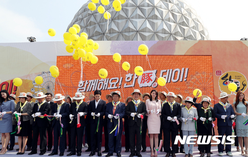 【과천=뉴시스】이종철 기자 = 30일 경기 과천 서울랜드에서 열린 '제4회 한돈데이' 행사에 참석한 농림축산식품부 김영록 장관, 농협축산경제 김태환 대표이사, 한돈자조금관리위원회 이병규 위원장, 한돈 홍보모델 배우 조정석, 헬로비너스 나라 등 참석자들이 테이프 커팅을 하고 있다. 2017.09.30.