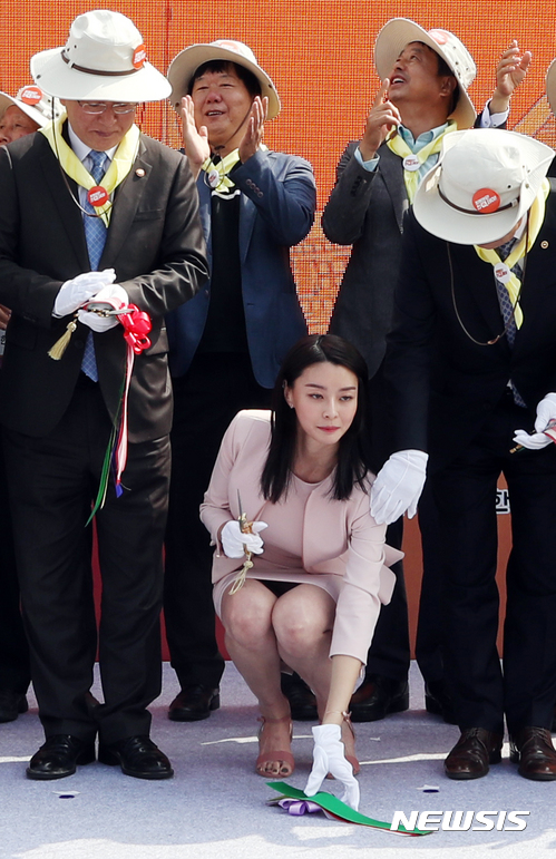 【과천=뉴시스】이종철 기자 = 30일 경기 과천 서울랜드에서 열린 '제4회 한돈데이' 행사에 참석한 한돈 홍보모델 헬로비너스 나라가 테이프 커팅을 한후 테이프를 수거하고 있다. 2017.09.30.