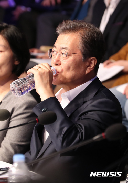 【서울=뉴시스】전진환 기자 = 문재인 대통령이 11일 오후 서울 마포구 에스플렉스센터에서 열린 4차산업혁명위원회 출범 및 제1차회의에 참석해 물을 마시고 있다. 2017.10.11.