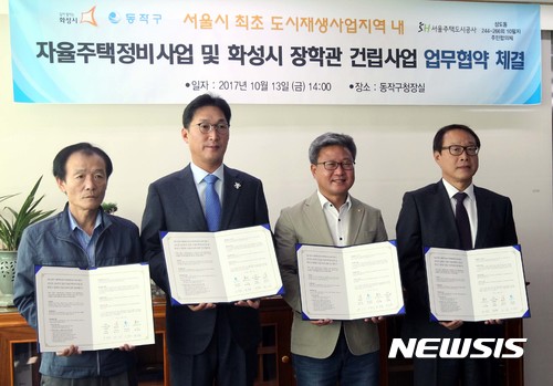 【서울=뉴시스】 13일 오후 서울시 동작구 노량진동 동작구청에서 이창우 동작구청장, 채인석 화성시장, 이용건SH공사 본부장, 성영화 주민합의체대표가 자율주택정비사업 및 장학관사업 업무협약을 체결한 뒤 기념촬영을 하고 있다. 2017.10.13. (사진=동작구 제공)