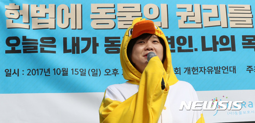 【서울=뉴시스】이영환 기자 = 15일 오후 서울 여의도 국회 개헌자유발언대 앞에서 열린 세계 동물권 선언의 날 '오늘은 내가 동물대변인, 나의 목소리를 들어줘!'에 참석한 정의당 이정미 대표가 오리 복장을 하고 발언하고 있다. 2017.10.15.