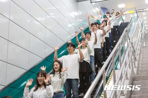 【서울=뉴시스】 19일 서울 우이신설선 성신여대입구역 역사 내 환승통로에서 연극 파란나라 출연진이 '아트스테이션'과 '유 아 더 스타' 설치물을 배경으로 '파란 나라' 노래에 맞춰 플래시몹을 하고 있다.