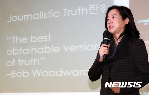【서울=뉴시스】배훈식 기자 = 26일 오전 서울 여의도 의원회관 제3세미나실에서 열린 한반도선진화재단 정책세미나 '혁신과 통합을 위한 새로운 방송·언론 생태계 모색과 과제'에 참석한 박성희 이화여대 커뮤니케이션미디어학부 교수가 주제 강의를 하고 있다. 2017.10.26.
