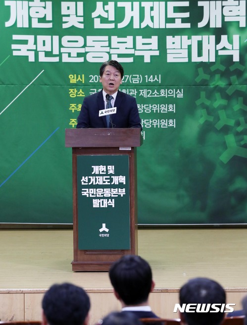 【서울=뉴시스】홍효식 기자 = 국민의당 안철수 대표가 27일 오후 서울 여의도 국회 의원회관에서 국민의당 제2창당위원회가 주최해 열린 개헌 및 선거제도 개혁 국민운동본부 발대식에 참석해 인사말을 하고 있다. 2017.10.27.