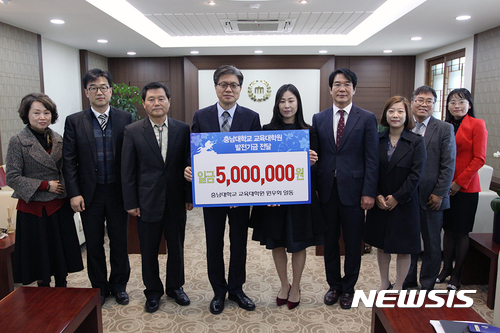 【대전=뉴시스】유순상 기자 = 충남대 교육대학원 원우회가 30일 교내에서 오덕성(왼쪽 네번째) 총장에게 대학발전기금 500만원을 기탁한 가운데 윤여희 회장 등이 기념촬영을 하고 있다. 2017.10.30.(사진=충남대 제공)