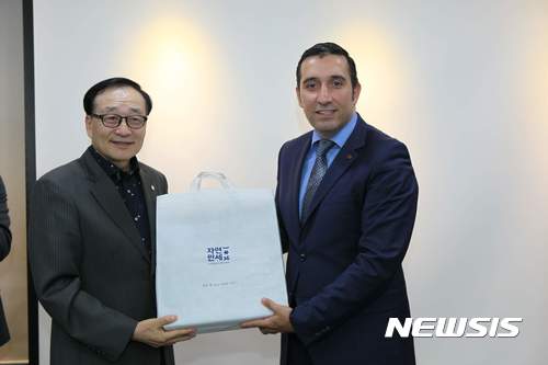 【서울=뉴시스】30일 서울 역삼동 터키문화원에서 코리아씨이오서밋(이사장 박봉규) 주최로 열린 HERMES CICON(헤르메스 씨콘) 시즌4, 7차수업에서 리재학 UN NGO 경제국제기구 WDF(세계유통연맹) 의장이 토프락 웨이스니오 LG CNS 해외마케팅 부장(전 터키국무총리실 해외투자청장)에게 감사선물을 전달하고 있다.