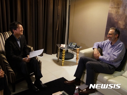 【예루살렘(이스라엘)=뉴시스】김난영 기자 = 안철수 국민의당 대표가 6일(현지시각) 창업 독려를 통한 이스라엘 경제 성장 노하우를 담은 '스타트업네이션(번역명 창업국가)' 공동저자인 사울 싱어에게 창업 활성화를 위한 조언을 듣고 있다. 2017.11.06. [email protected]