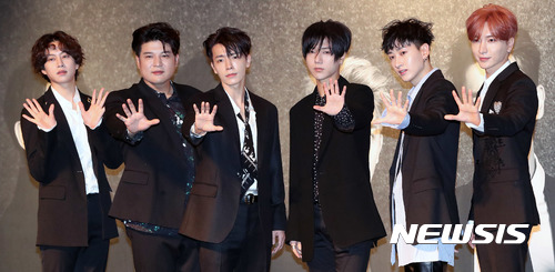 【서울=뉴시스】김선웅 기자 = 6일 오전 서울 강남구 그랜드 인터컨티넨탈 서울 파르나스에서 열린 그룹 슈퍼주니어 정규 8집 'PLAY' 컴백 기자회견에서 멤버들이 포즈를 취하고 있다. 왼쪽부터 김희철, 신동, 동해, 예성, 은혁, 이특. 2017.11.06.