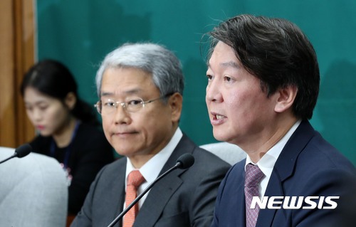 【서울=뉴시스】홍효식 기자 = 국민의당 안철수(오른쪽) 대표가 13일 오전 서울 여의도 국회에서 열린 정책 의원총회에 참석해 예산안 심의 관련 모두발언을 하고 있다. 왼쪽은 김동철 원내대표. 2017.11.13.