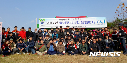 【대전=뉴시스】유순상 기자 = 충남대 산림환경자원학과 전공 교수 4명과 학과 2~4학년 70여명의 학생들이 14일 청양군 청양읍 송방리 국유림 일대에서 부여국유림관리소와 공동으로 소나무 가지치기를 하고 기념촬영을 하고 있다. 2017.11.14.(사진=충남대 제공)