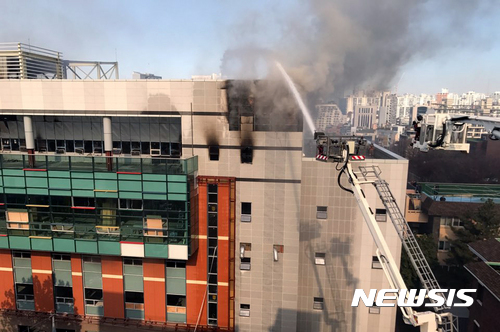 【서울=뉴시스】권현구 기자 = 16일 서울 서초구 서울교육대학교 체육관 신축 공사 현장에서 화재가 발생,소방 관계자들이 화재를 진압하고 있다. 2017.11.16. [email protected]