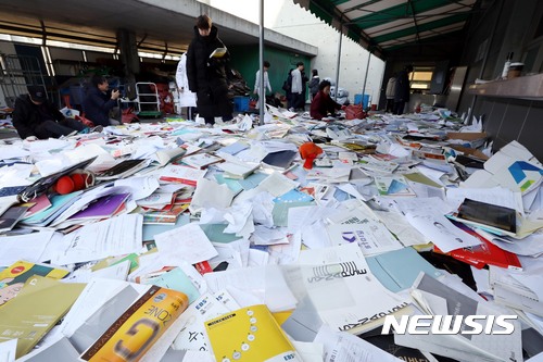 【서울=뉴시스】조성봉 기자 = 포항지진 여파로 2018학년도 대학수학능력시험이 연기된 16일 오전 서울 중구 종로학원 옥상에서 수험생들이 버렸던 참고서와 학습지를 다시 찾고 있다. 2017.11.16.