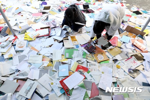 【서울=뉴시스】조성봉 기자 = 포항지진 여파로 2018학년도 대학수학능력시험이 연기된 16일 오전 서울 중구 종로학원 옥상에서 수험생들이 버렸던 참고서와  학습지를 다시 찾고 있다. 2017.11.16.