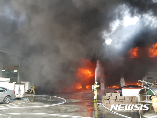 【속초=뉴시스】김경목 기자 = 18일 오전 11시47분께 강원 속초시 대포농공단지 내 폐차장에서 원인이 밝혀지지 않은 불이 난 가운데 속초소방서 대원들이 화재 진압을 하고 있다. 2017.11.18. (사진=속초소방서 제공)