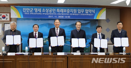 【진안=뉴시스】윤난슬 기자 = 전북 진안군은 28일 군청에서 전북신용보증재단과 관내 영세 소상공인 자금지원을 위한 특례보증 협약을 체결하고 있다.