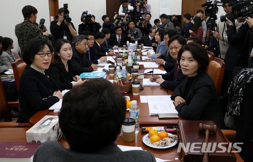 【서울=뉴시스】홍효식 기자 = 28일 오전 서울 여의도 국회 환경노동위원회 소회의실에서 열린 고용노동소위원회에 참석한 임이자 소위원장, 더불어민주당 한정애, 국민의당 김삼화 간사 등 여야 의원들이 근로시간 단축안을 담은 근로기준법 일부개정법률안 등을 논의하고 있다. 2017.11.28.