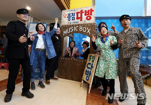 【서울=뉴시스】박주성 기자 = 30일 오전 서울 마포구 서울시50플러스 중부캠퍼스에서 '놀장' 주제로 7080 복고 콘셉트 캠퍼스 축제가 열려 50+세대와 2030세대들이 청자켓과 나팔바지, 장발가발, 교복 등 추억의 의상을 입고 포즈를 취하고 있다. 2017.11.30.