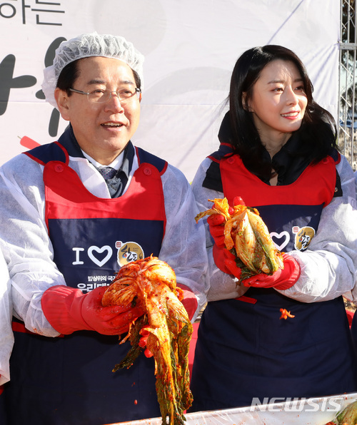 【서울=뉴시스】이영환 기자 = 1일 오전 서울 여의도 국회 생생텃밭에서 열린 '국회 생생텃밭과 함께하는 한돈 김장나눔' 행사에 참석한 김영록(왼쪽) 농림축산식품부 장관과 한돈 홍보모델 헬로비너스 나라가 김장을 하고 있다.