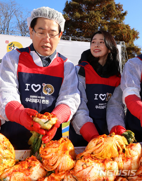 【서울=뉴시스】이영환 기자 = 1일 오전 서울 여의도 국회 생생텃밭에서 열린 '국회 생생텃밭과 함께하는 한돈 김장나눔' 행사에 참석한 김영록(왼쪽) 농림축산식품부 장관과 한돈 홍보모델 헬로비너스 나라가 김장을 하고 있다.
