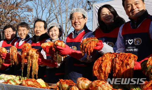 【서울=뉴시스】이영환 기자 = 1일 오전 서울 여의도 국회 생생텃밭에서 열린 '국회 생생텃밭과 함께하는 한돈 김장나눔' 행사에 참석한 더불어민주당 설훈(왼쪽부터) 의원, 하태식 한돈자조금관리위원장, 정세균 국회의장 , 더불어민주당 임종성(오른쪽부터) 의원, 한돈 홍보모델 헬로비너스 나라, 김영록 농림축산식품부 장관이 김장을 하고 있다.