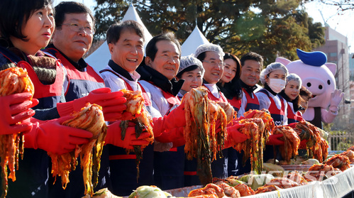 【서울=뉴시스】이영환 기자 = 1일 오전 서울 여의도 국회 생생텃밭에서 열린 '국회 생생텃밭과 함께하는 한돈 김장나눔' 행사에 참석한 더불어민주당 손혜원(왼쪽부터), 설훈 의원, 하태식 한돈자조금관리위원장, 정세균 국회의장 , 더불어민주당 임종성(오른쪽 세 번째부터) 의원, 한돈 홍보모델 헬로비너스 나라, 김영록 농림축산식품부 장관이 김장을 하고 있다.