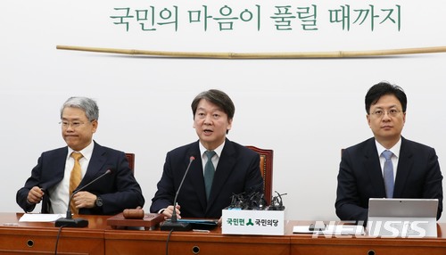 【서울=뉴시스】홍효식 기자 = 국민의당 안철수(가운데) 대표가 4일 오전 서울 여의도 국회에서 열린 제37차 최고위원회의에 참석해 인천 낚싯배 사고와 관련해 모두발언을 하고 있다. 왼쪽부터 김동철 원내대표, 안 대표, 장진영 최고위원. 2017.12.04.