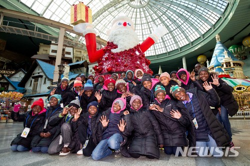 【서울=뉴시스】 12일 서울 송파구 롯데월드 어드벤처가 케냐 지라니 합창단을 초청해 진행한 ‘드림티켓’ 행사에서 케냐 아이들이 단체사진을 촬영하고 있다. 2017.12.12. (사진=롯데월드 제공)