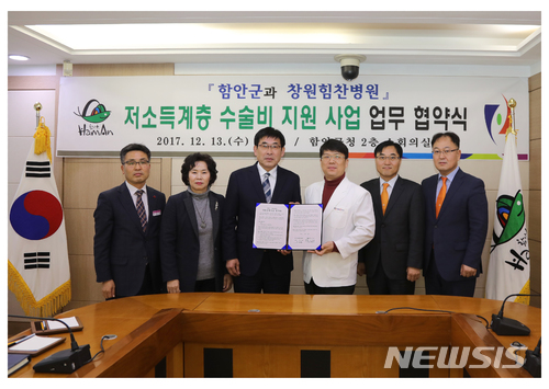 【함안=뉴시스】김기진 기자 = 13일 경남 함안군은 군청 2층 소회의실에서 창원힘찬병원(병원장 안농겸)과 관내 저소득계층을 대상으로 ‘수술비 지원’을 위한 업무 협약을 체결하고 있다. 2017.12.14. (사진=함안군 제공)