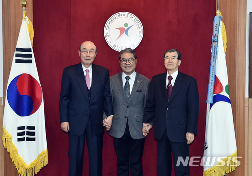 【수원=뉴시스】이준석 기자 = 이재정 경기도교육감은 20일 오전 도교육청 교육감실에서 조성윤(10, 11대·왼쪽), 윤옥기(12대·오른쪽) 전 교육감과의 간담회를 갖고 경기교육의 발전 방향에 대해 의견을 나눴다. 2017.12.20. (사진=경기도교육청 제공)