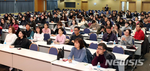 【서울=뉴시스】권현구 기자 = 23일 오후 서울 용산구 숙명여자대학교 백주년기념관에서 열린 '2018학년도 정시모집 입학설명회'를 찾은 수험생과 학부모들이 입시설명을 경청하고 있다. 201712.23.